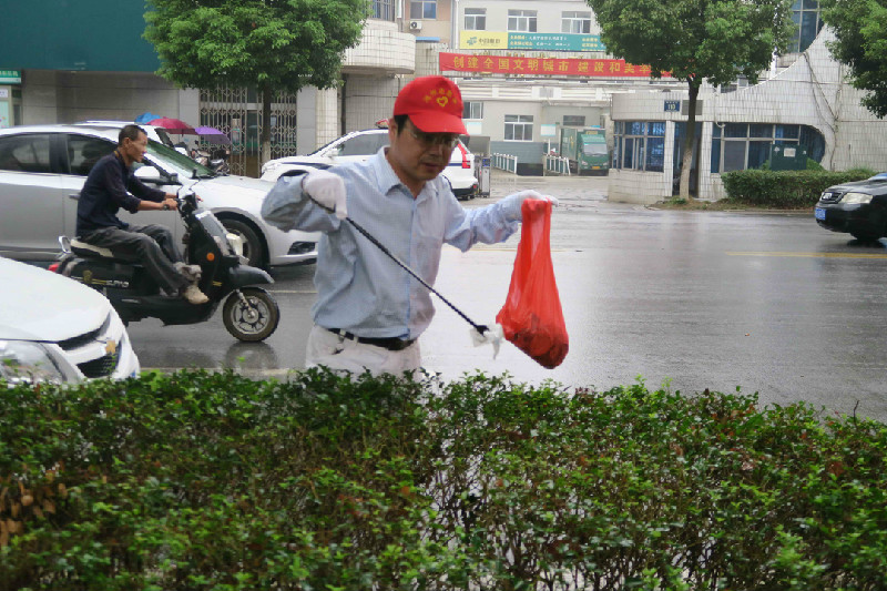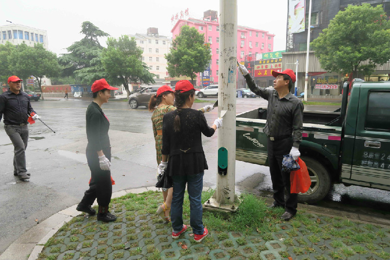 今天上午天空还飘着蒙蒙细雨,汪力局长带领全体志愿者冒雨上街,带着着铲子、扫帚、钳子等工具,对路边垃圾、绿化带内的杂草及路灯杆、电线杆上的小广告等展开清扫清除活动,以实际行动投身文明城市创建工作。大家分成若干组,对路段进行全方位的清扫,有的拿着小铲子,有的舞动扫帚,认真清扫着路面垃圾,清理着“牛皮癣”小广告,保持路段干净整洁。同时还开展了环境卫生宣传,劝导沿街商户勿乱丢垃圾、乱泼脏水,为文明城市创建发挥每个人的力量。