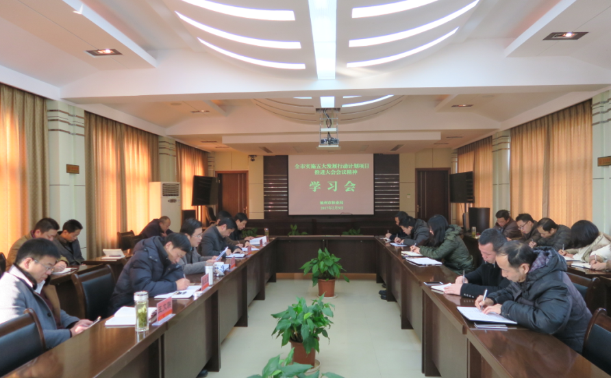 在传达全市实施五大发展行动计划项目推进大会会议精神时,汪局长说:市委、市政府召开全市实施五大发展行动计划项目推进大会,是贯彻落实五大发展理念的具体行动,吹响了新年工作集结号。会议要求,要坚持以五大发展理念为引领,以“五大发展行动”为抓手,按照全市实施五大发展行动计划项目推进大会的部署要求,做好我局当前三项具体工作。一是要收心归位,全面消除“春节综合征”,全力投入当前工作。二是突出重点,在圆满完成春节期间森林防火工作任务之后,乘胜前进,继续做好元宵期间的全市森林防火工作;加大植树造林工作力度,确保到三月中旬全面完成省林业厅下达的造林任务;选好点,备好苗,筹备好今年全市义务植树工作;做好2016年的各项考核工作。三是要勤政廉政,以上率下、以身作则,做遵纪守法的表率,以风清气正的作风,高效的工作效率为我市实施的“五大发展”做贡献。