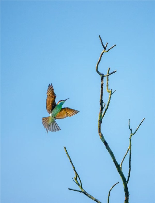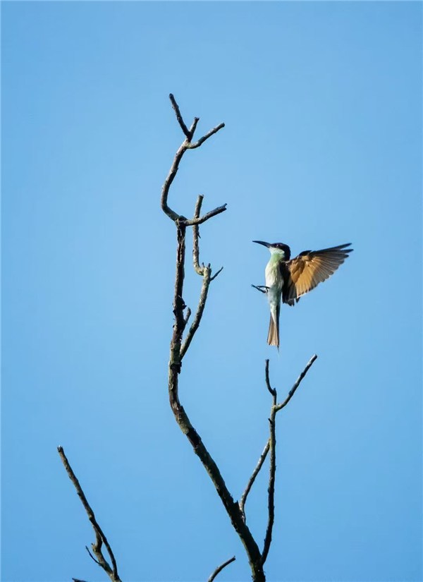 据了解,蓝喉蜂虎因喉部呈蓝色、喜欢食用蜂类而得名。其羽毛俏丽、体形优美、歌喉嘹亮,极具观赏价值,被誉为“中国最美的小鸟”。