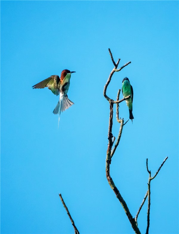 近日,九华山一名野生动物摄影爱好者在九华山风景区后山拍摄风光时,意外拍摄到两只国家二级重点保护野生动物——蓝喉蜂虎觅食的场景。