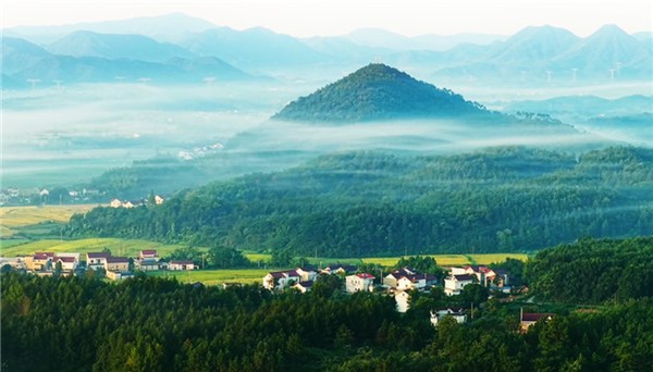 在殷汇镇马草深村,错落有致的民居与金秋时节的稻田相映成趣,清澈的河流、连绵的青山与缭绕的云海融为一体,共同勾勒出一幅静谧而生动的生态画卷。