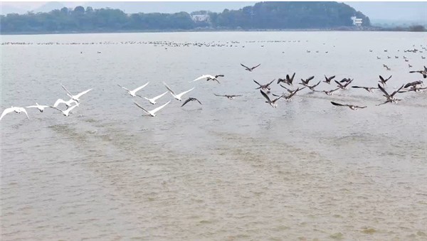 湖边的村庄里,村民们也自发加入到候鸟保护的行列中。东至县张溪镇联盟村管村组村民管胜华提着塑料桶,沿岸捡拾垃圾。“这些年看着候鸟一年比一年多,心里真高兴。”他说,候鸟是“吉祥鸟”,保护它们就是保护我们的家园。现在村里没人去湖边捕鱼、捡鸟蛋了,大家还会主动给候鸟提供食物,让它们在这儿住得安心。