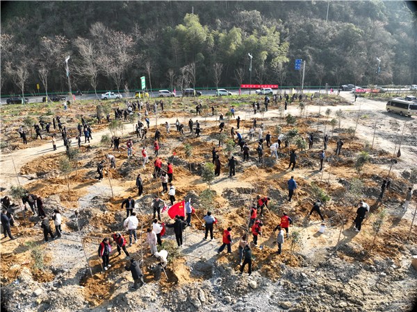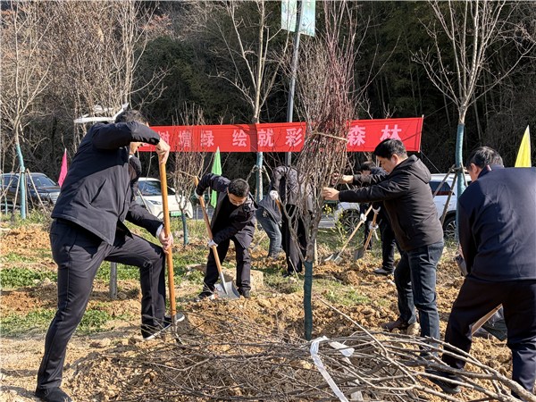 植树现场,大家热情高涨、干劲十足。干部职工三五成群,分工协作,扶苗、培土、踩实、浇水,每个环节都认真细致、规范有序。经过一上午的共同努力,共栽植红梅、红枫、银杏、桂花等彩叶树种500株。一株株新苗整齐排列,在春日暖阳下迎风挺立,展现出蓬勃生机,为山林增添了一片新绿。